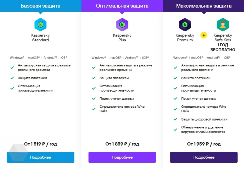 Все тарифы кроссплатформенные и совместимы с устройствами на базе Windows, Android, iOS и macOS. В базовый план входит антивирусная защита и функциональность для ускорения компьютера. Kaspersky Plus предлагает диагностику жёсткого диска и премиум-версии программ Who Calls и Password Manager.