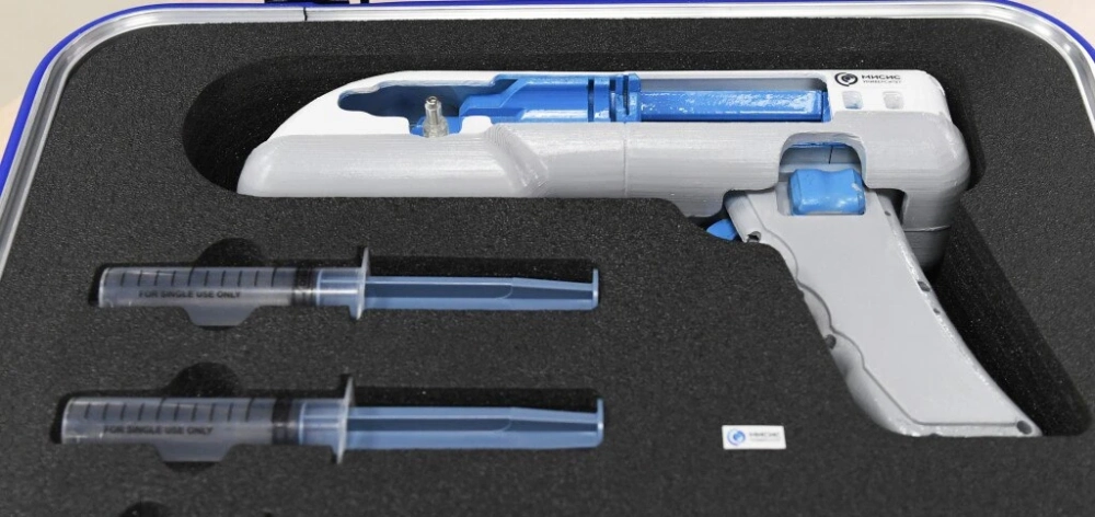 «Перед работой два стандартных шприца объёмом 20 мл заправляются биополимерами и медицинскими препаратами. Через специальный порт подсоединяется третий шприц и выполняется заправка устройства сшивающим агентом, далее заправляющий шприц отключается. При нажатии на курок ультразвуковая система одномоментно собирает все компоненты в области печати, тем самым формируя полимерный сшитый биоматериал, способный останавливать кровотечение и ускорять регенерацию ткани», — автор разработки Тимур Айдемир, инженер НОЦ Биомедицинской инженерии НИТУ МИСИС.