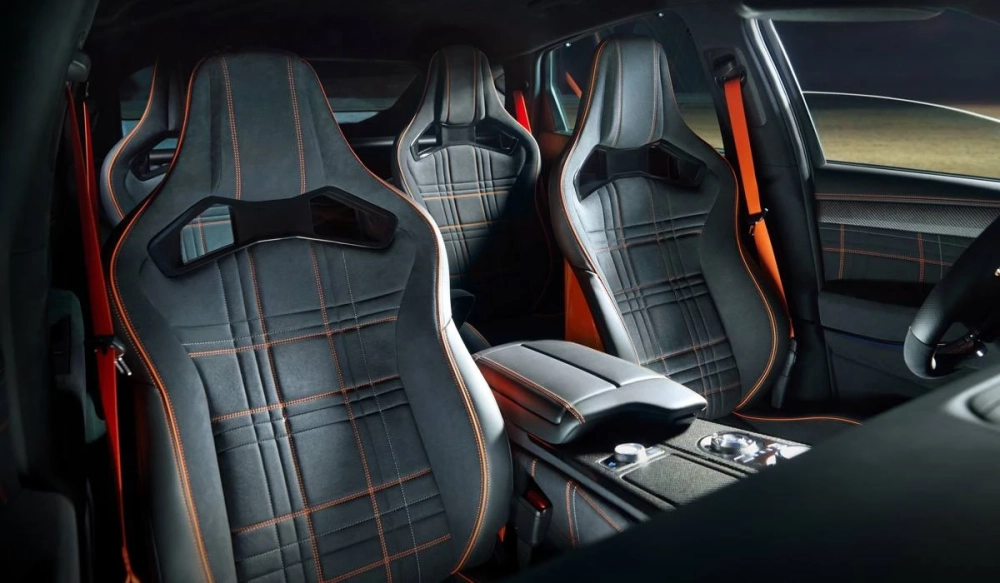 Внутри есть четыре кресла с углепластиковым каркасом и оранжевой отделкой. Оранжевые ремни безопасности и новый трёхспицевый руль прилагаются.