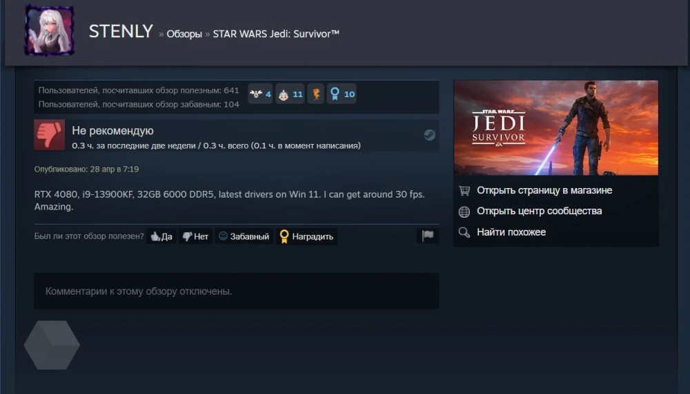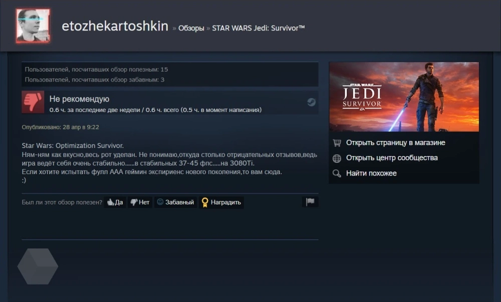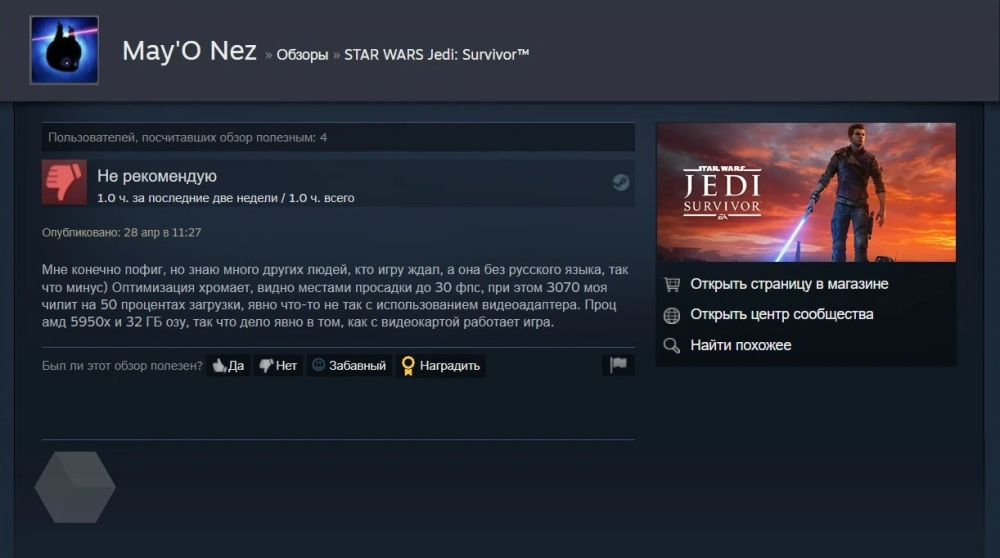 Пользователи Steam обрушили рейтинг Star Wars Jedi: Survivor