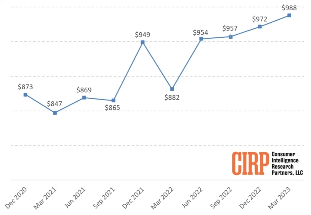 В первом квартале 2023 года средняя стоимость продажи нового iPhone составила 988 долларов (~79 100 рублей), подсчитали аналитики CIRP. Это рекорд за всё время наблюдений.