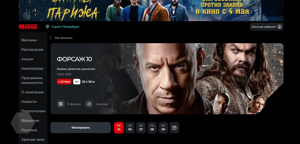 Боевик «Форсаж 10», который выйдет во всём мире 17 мая, будут показывать в российских кинотеатрах с 25 мая. Такая дата появилась на сайте кинотеатра «Мираж», на что обратил внимание «Чемпионат».