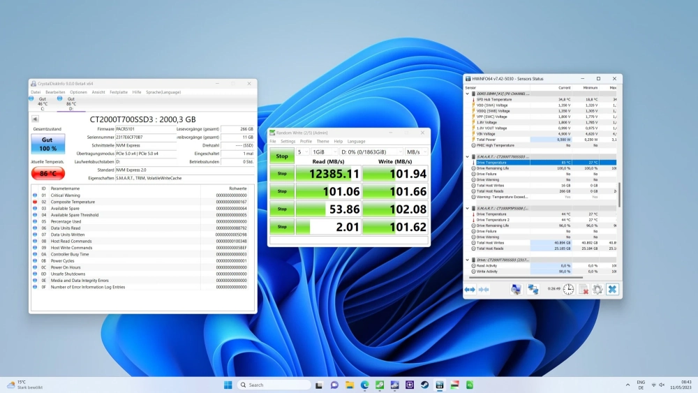 Модель Crucial T700 PCIe Gen5 NVMe ведёт себя иначе. SSD имеет функцию защиты: он будет продолжать работать даже при перегреве, но скорости передачи данных катастрофически упадут — с 12 ГБ/с до примерно 100 МБ/с. Это уровень обычного HDD.