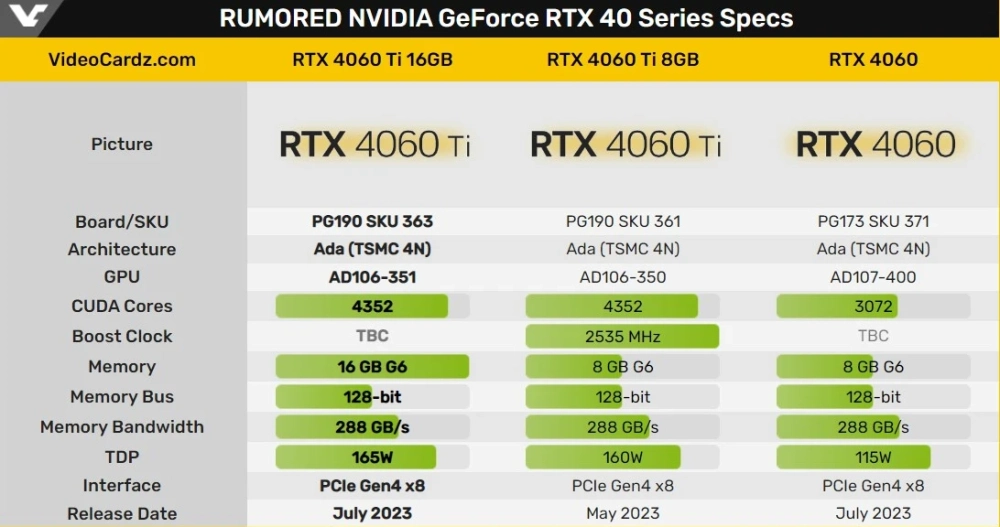 Видеокарта Nvidia GeForce RTX 4060 Ti 16 ГБ получит другой вариант графического процессора, и у неё будет выше TDP, чем у модели с 8 ГБ видеопамяти. Об этом пишет портал Videocardz.