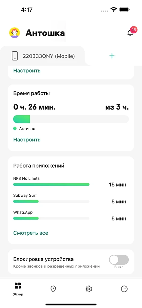Ребёнок может сразу увидеть установленные ограничения, а родители могут мгновенно ограничить доступ к конкретным приложениям.