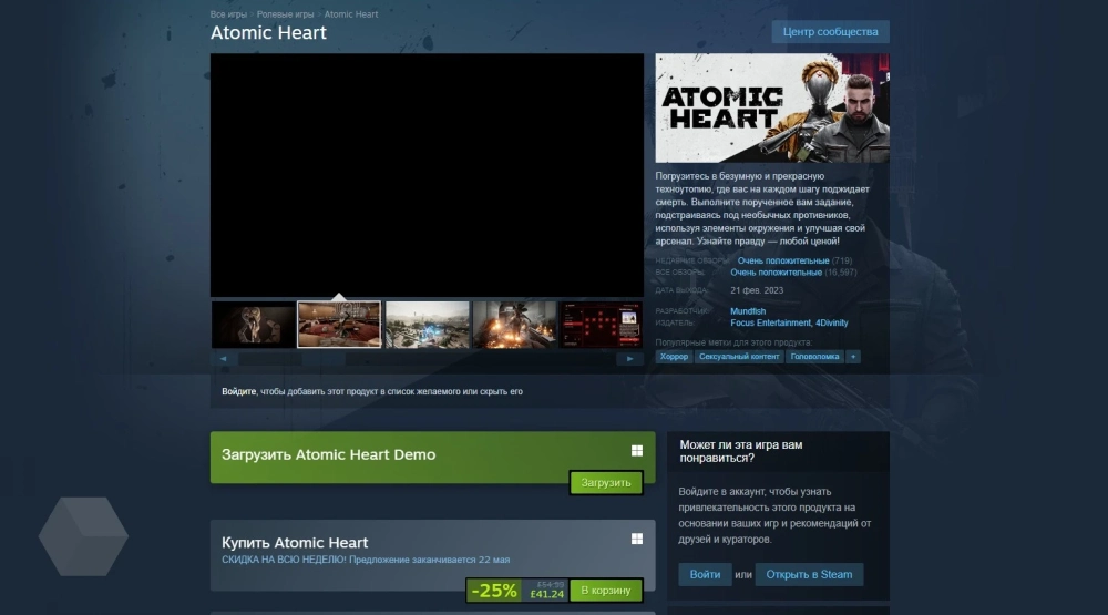 В российском сегменте Steam шутер недоступен для покупки, а значит и нет возможности поиграть в демоверсию. Это касается не только РФ, но и других стран СНГ, жители которых могут приобрести тайтл только в VK Play. Для всех остальных предложение актуально. К слову, до 22 мая Atomic Heart в Steam продают со скидкой.