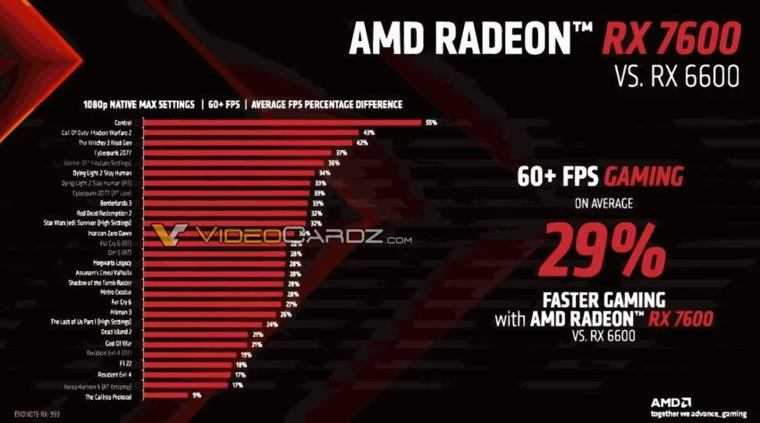 AMD утверждает, что RX 7600 в среднем на 29% быстрее, чем RX 6600 в играх с разрешением 1080p и при максимальных настройках графики.