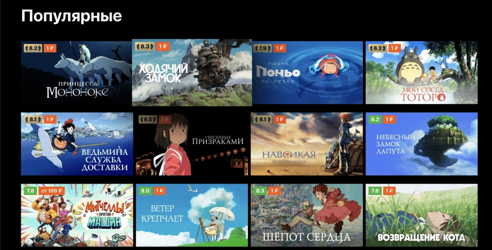 Например, почти за так можно получить фильмы «Возвращение кота», «Принцесса Мононоке», «Ходячий замок», «Унесённые призраками» и другие.