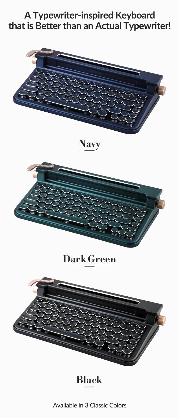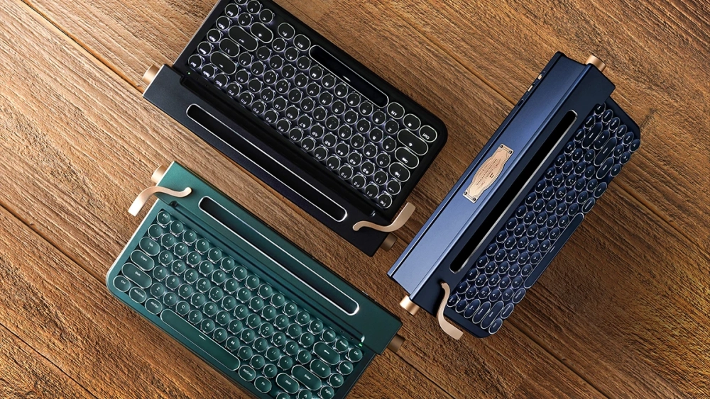 Девайс выполнен в стиле классической печатной машинки, даже есть характерные боковые ручки. С помощью них можно регулировать подсветку или громкость на сопряжённом устройстве. Клавиатура совместима с Windows, Mac, iOS и Android. Подключается по Bluetooth 5.0. Если нужно проводное соединение, то оно тоже предусмотрено. У клавиатуры имеется специальный порт, в который можно вставить смартфон или планшет.