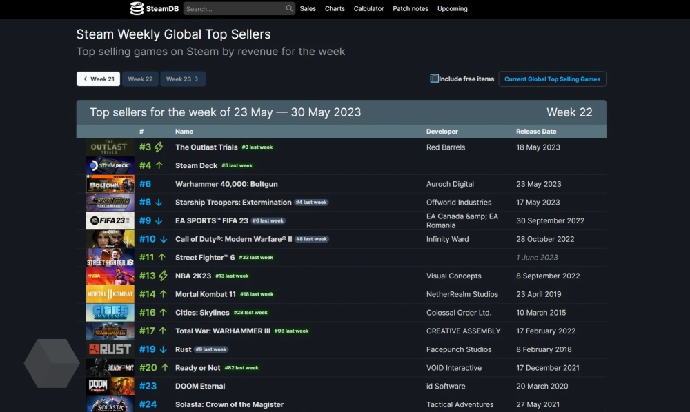 Valve опубликовала список самых прибыльных товаров в Steam за неделю с 23 по 30 мая. Топ платных тайтлов, как и неделей ранее, возглавляет кооперативная The Outlast Trials. За первые семь дней с момента выхода в раннем доступе игру купили более 500 000 раз.