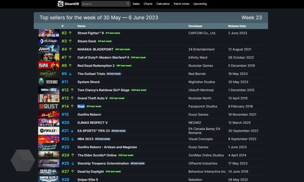 Список платных продуктов возглавил файтинг Street Fighter 6, который пришёлся по душе и геймерам, и критикам. Сразу за ним идёт Steam Deck. Замыкает топ-3 NARAKA: BLADEPOINT. The Outlast Trials, которая возглавляла топ-10 неделей ранее, опустилась на шестое место.