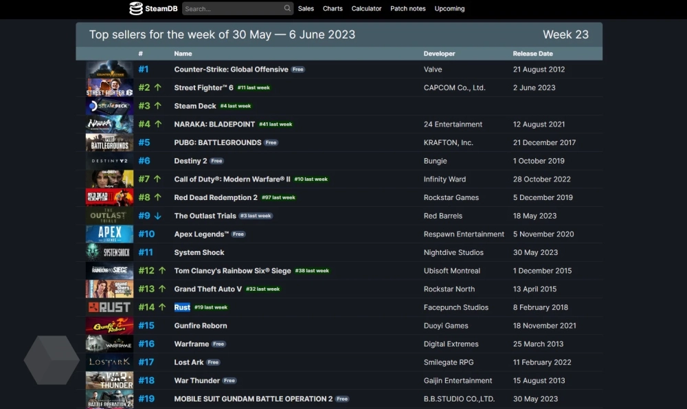 В общем топ-100 (включая игры F2P) лидер не изменился — Counter-Strike: Global Offensive. На втором месте Street Fighter 6. Steam Deck замыкает тройку лидеров.