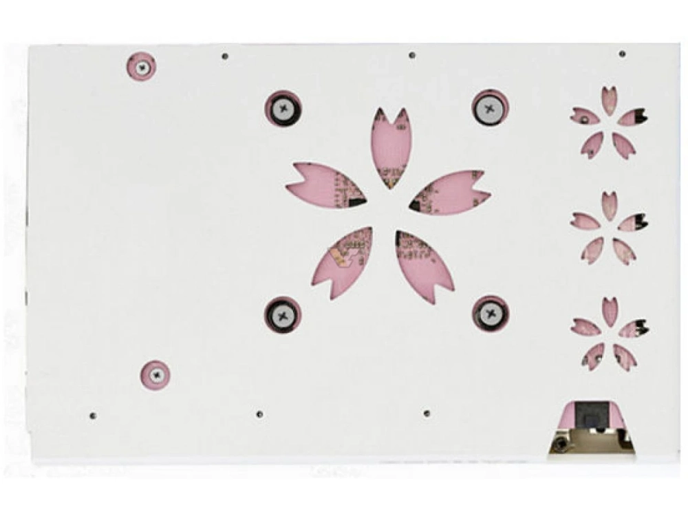 Главная фишка видеокарты — розовая печатная плата. Это первое подобное решение на рынке. Кожух при этом сделан в белом цвете и украшен красочным узором. На тыльной части есть белый бэкплейт, в котором имеются вырезы в форме цветочков.