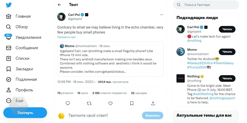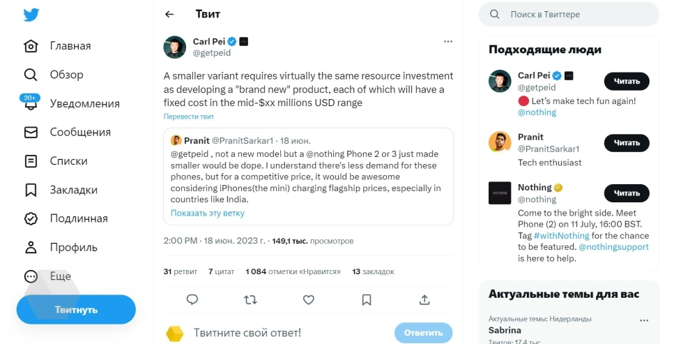 Судя по ответу Карла, в выпуске такого смартфона он не видит особого смысла. Во-первых, по мнению Пея, очень немногие люди покупают компактные смартфоны. Во-вторых, создание мини-версии Nothing Phone потребует таких же вложений ресурсов, как и разработка совершенно нового продукта.