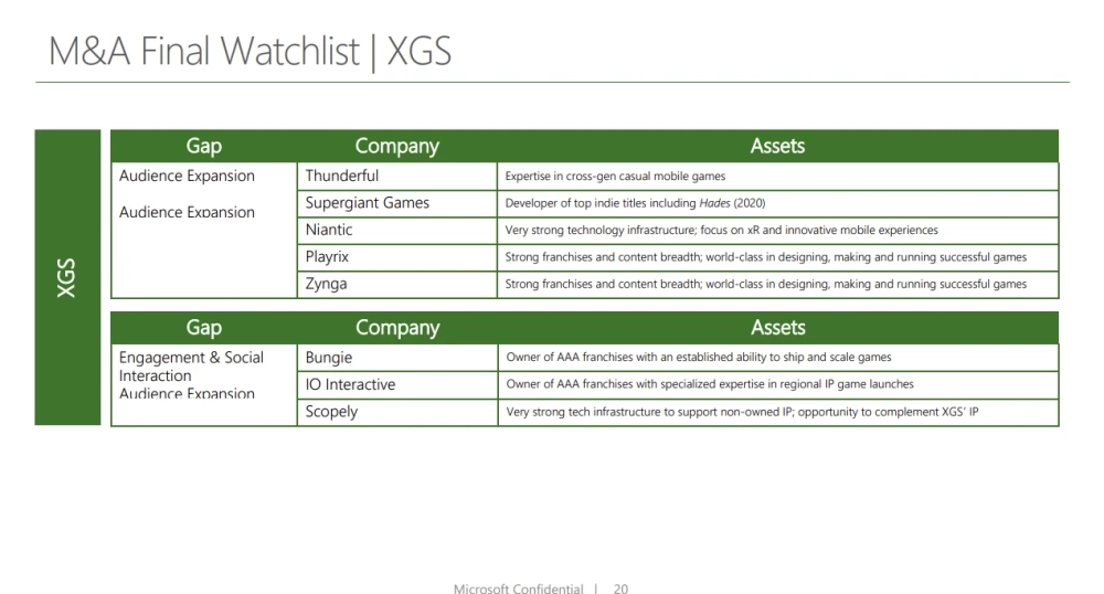 Другой документ от 2021 года перечисляет игровые компании, которые рассматривались Microsoft к приобретению. Среди них студия Bungie (принадлежит Sony с 2022 года), Niantic, Zynga (принадлежит Take-Two с 2022 года) и IO Interactive.