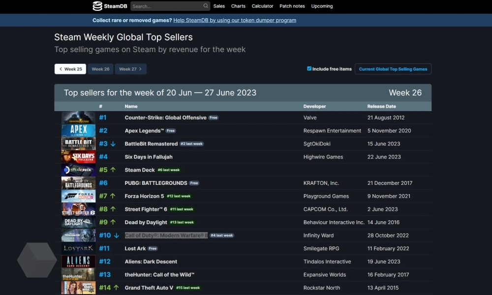 Вторник — это день, когда Valve обновляет список самых прибыльных товаров в магазине Steam. Это игры и устройства, которые генерируют наибольшую выручку в течение недели.
