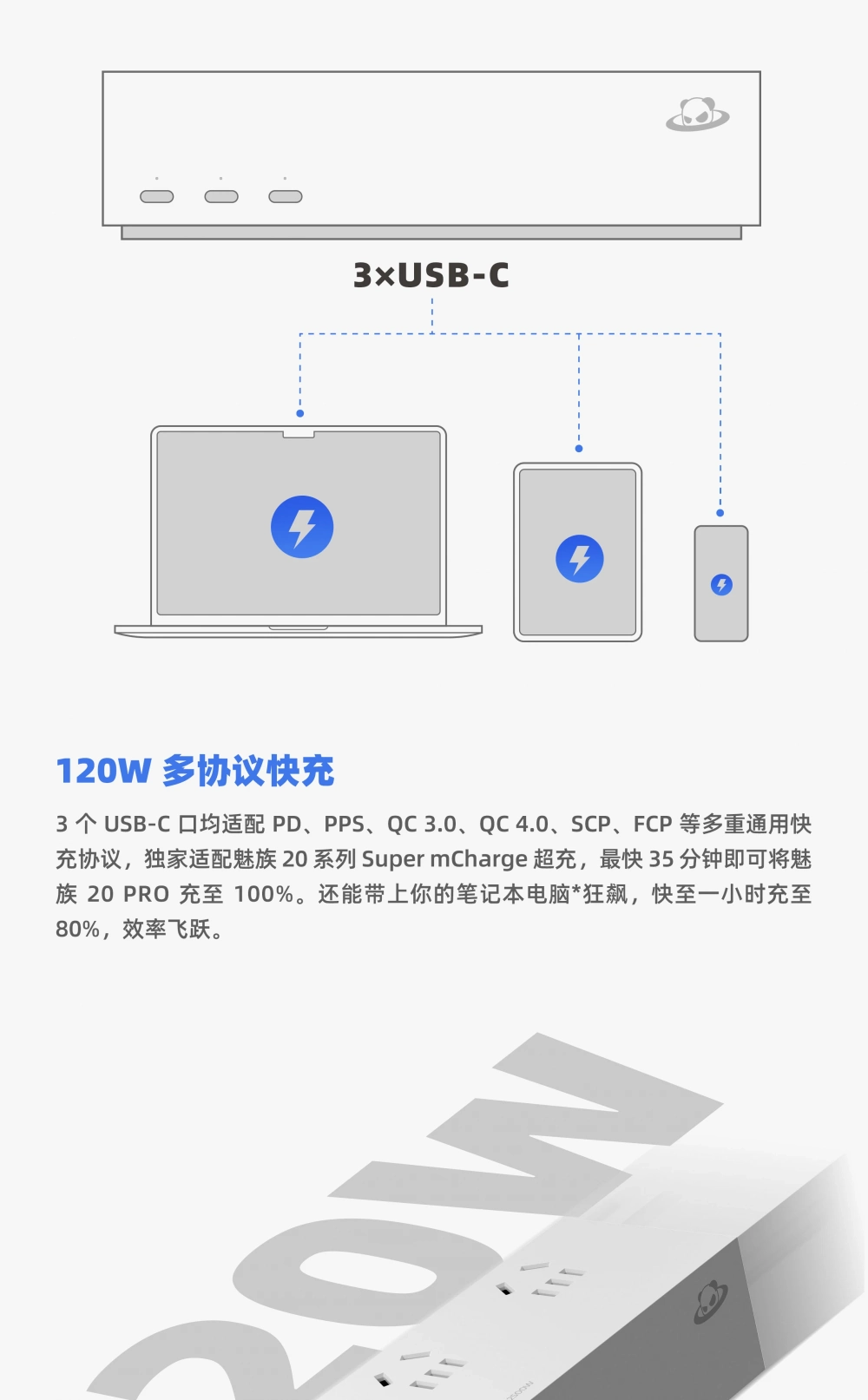 В наличии три розетки переменного тока, а также три порта USB-C на передней панели. Порты получили световой индикатор мощности зарядки: синий для 50–100 Вт, зелёный ниже 50 Вт и красный для низкоскоростной зарядки. Meizu также предлагает шнур питания длиной 1,8 м для этого продукта.