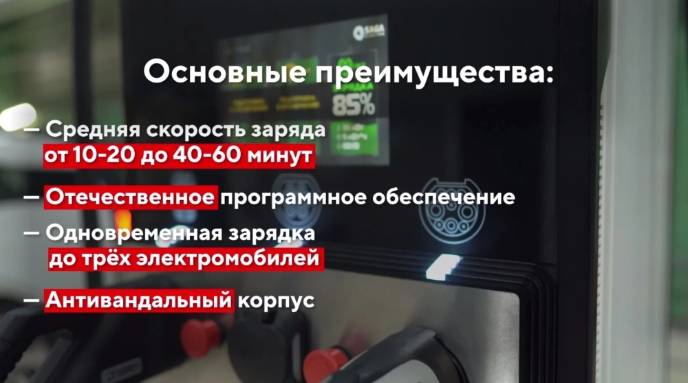Сообщается, что разработка на 100% «отечественная» — от компонентов до программного обеспечения. Станция способна заряжать одновременно три машины, в среднем от 10–20 до 40–60 минут.