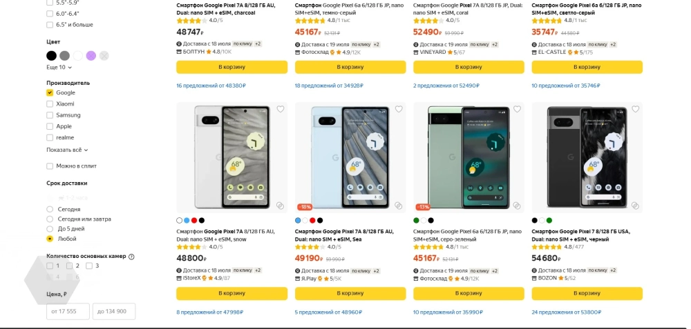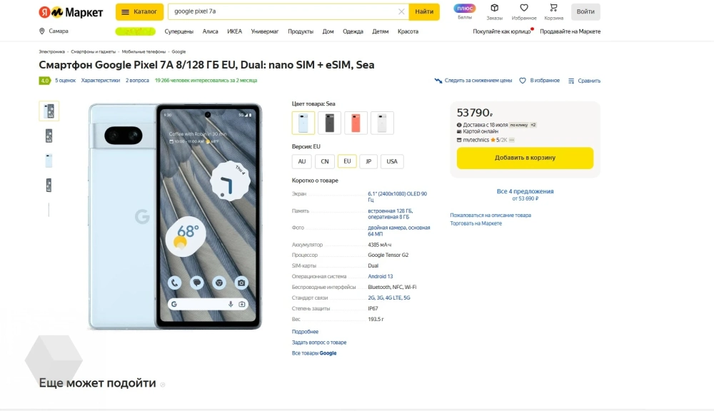 Помимо DNS купить Google Pixel 7a в России можно, к примеру, на «Яндекс Маркете». Там смартфон продаётся гораздо дешевле, но гарантию вряд ли кто-то даст: