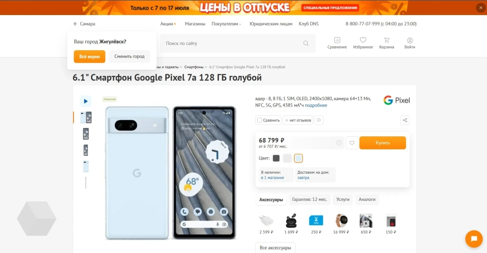Российский ритейлер DNS добавил в свой каталог среднебюджетный смартфон Google Pixel 7a, вот только цена у него флагманская — 68 799 рублей.