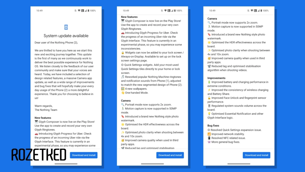 Основные изменения касаются камеры. Появились двухкратный цифровой зум в портретном режиме и возможность поставить фирменный водяной знак Nothing на снимки. Ещё уменьшена задержка при спуске затвора, а также улучшена работа HDR, чёткость при зуме между 4X и 10X, стабилизация видео и работа камеры в сторонних приложениях.