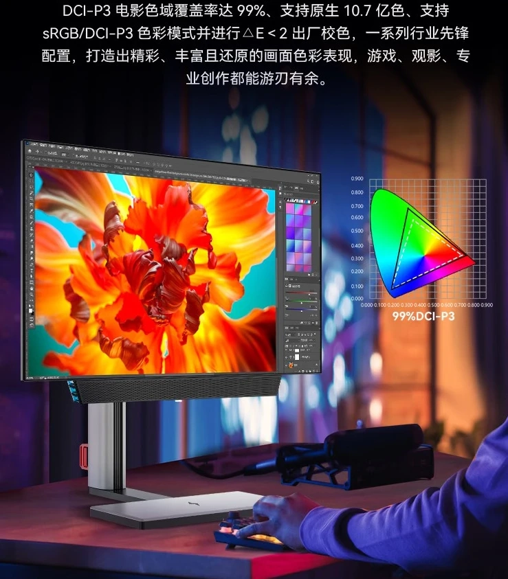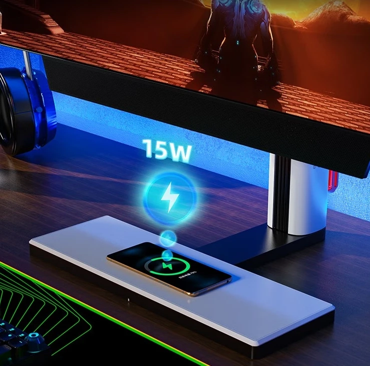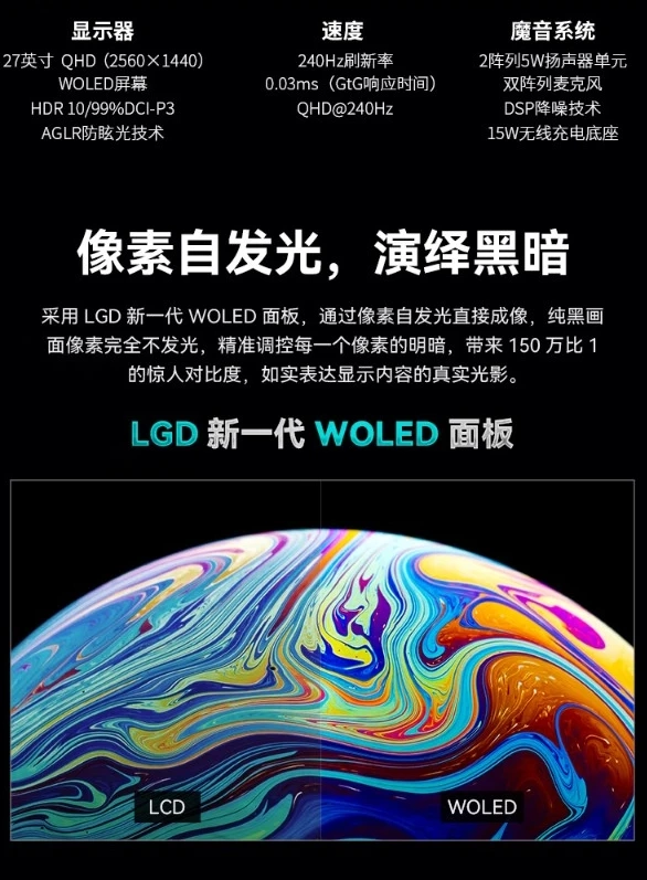 Новинка оснащается матрицей OLED с разрешением 2K, частотой обновления 240 Гц и временем отклика 0,3 мс (GtG). Яркость панели достигает 1000 нит, а коэффициент контрастности — 1,5 млн: 1. Монитор выполнен в нескучном дизайне и оснащается подставкой, в которую встроена беспроводная зарядка на 15 Вт.