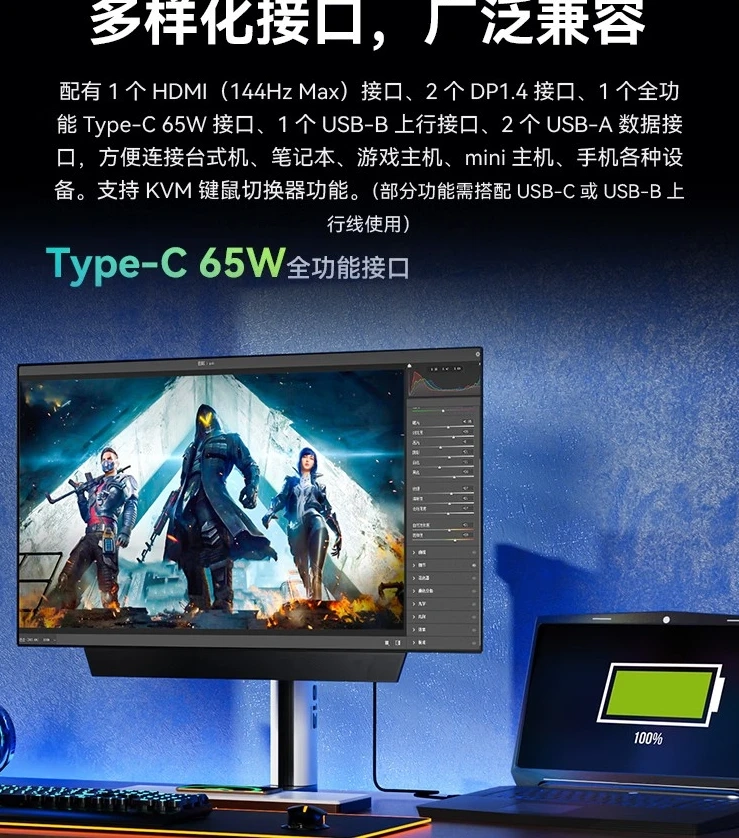 Есть у монитора и динамики — два по 5 Вт. Также в наличии микрофон с шумоподавлением. Панель можно отрегулировать по высоте, повороту и наклону, а также подвесить на стену. Из портов: HDMI, DisplayPort 1.4, USB-A, USB-B, USB Type-C (65 Вт) и 3,5 мм.