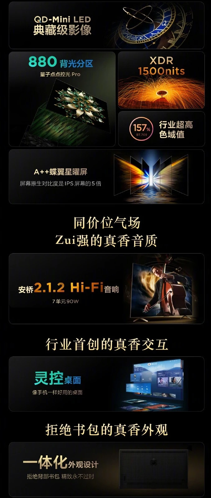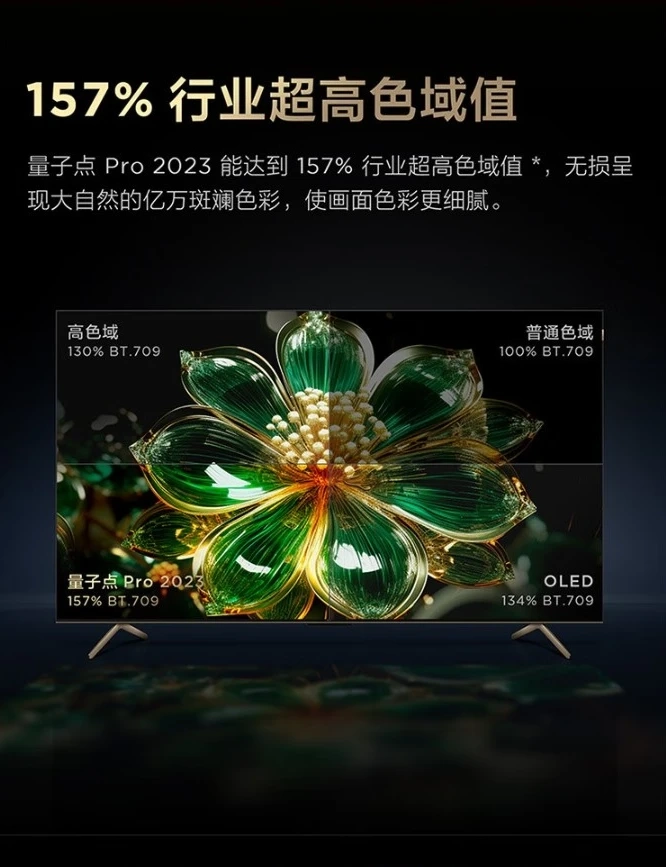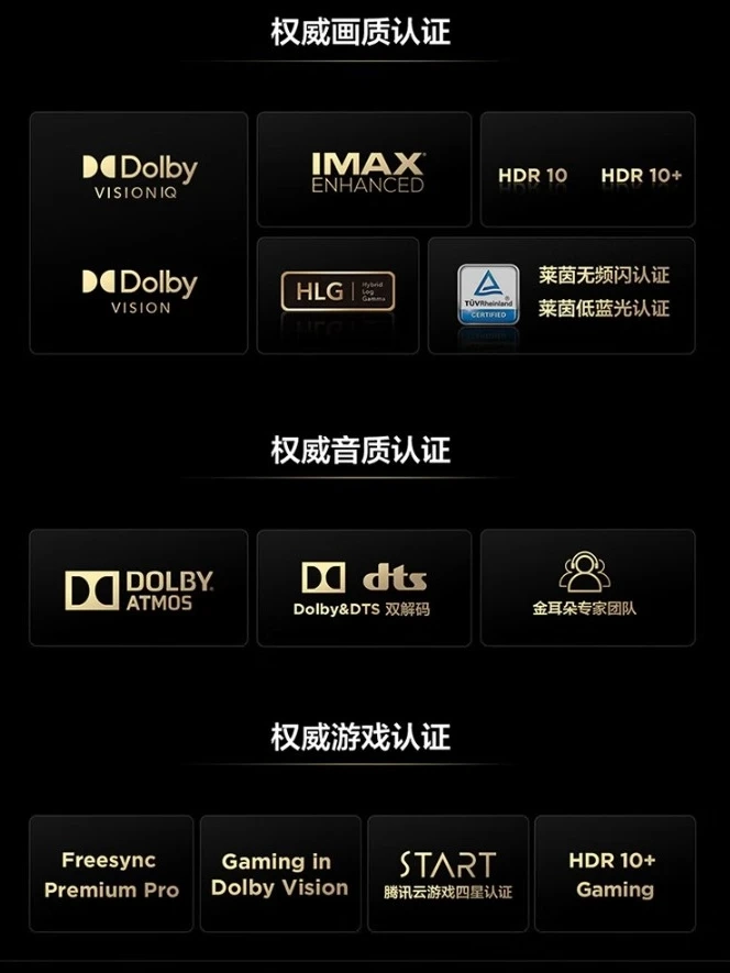 Заявленная яркость составляет 1500 нит, а коэффициент контрастности — до 15 млн:1. Охват гаммы BT.709 — 157%. Поддерживаются HDR 10, HDR 10+, HDR 10 Gaming, Dolby Vision и FreeSync Premium Pro. Телевизор получил сертификат IMAX Enhanced.