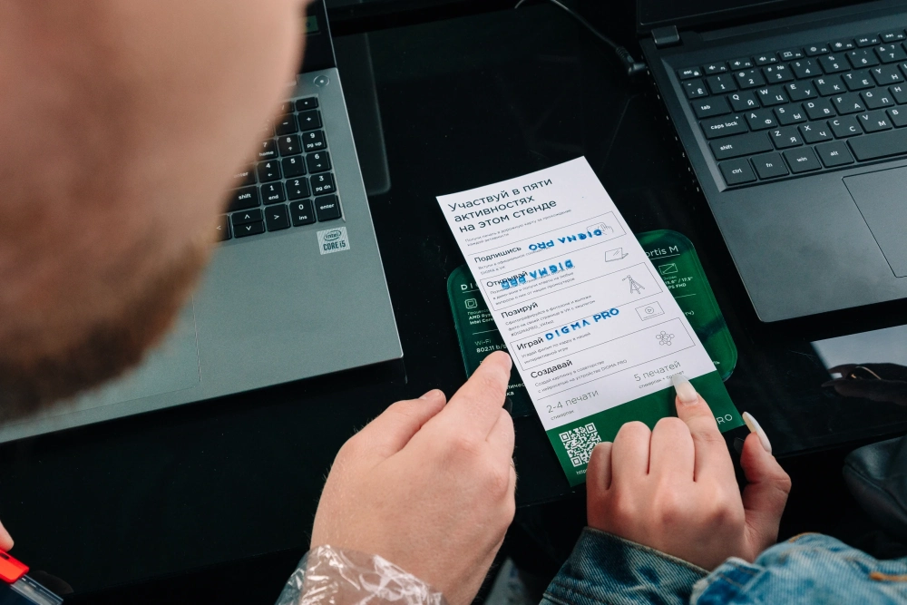 Суть первой активности довольно простая — берешь брошюрку и выполняешь пять небольших заданий, за каждое из которых получаешь печать. Собрал все? Получаешь браслет со стикерпаком. При этом ещё и участвуешь в розыгрыше ноутбука.