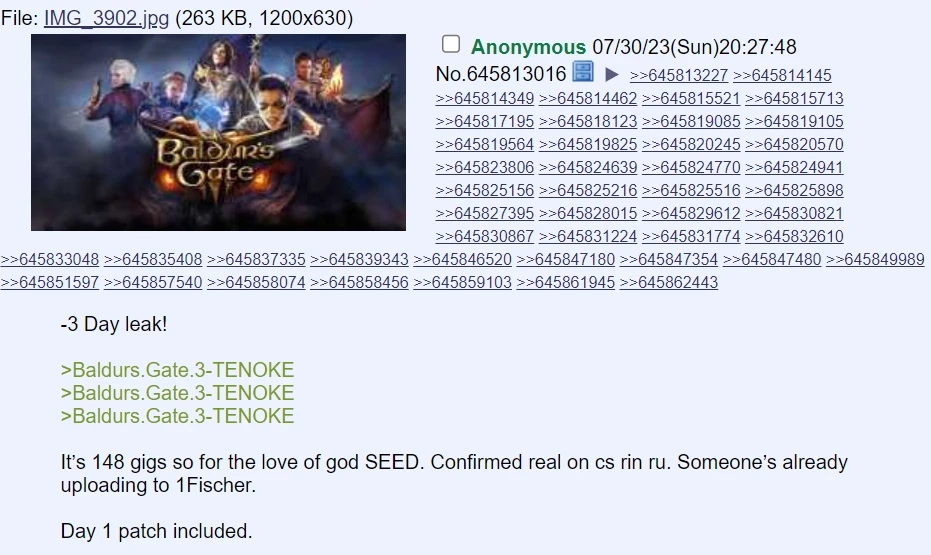 На форуме 4chan появилась запись о том, что группировка Tenoke выложила полную версию игры Baldur's Gate 3. Одними из первых это заметили в издании VGTimes.