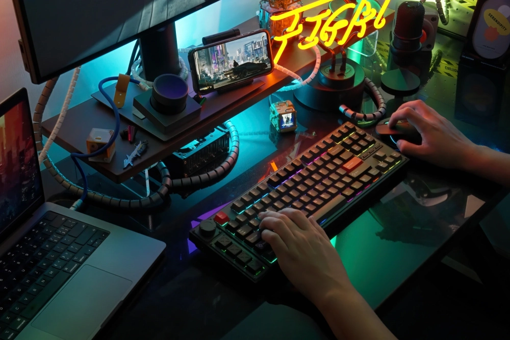 PBT-кейкапы выполнены по технологии двойного нанесения. Есть четыре программируемых кнопки, а также регулятор громкости на левой стороне клавиатуры. Плата оснащена настраиваемой RGB-подсветкой. Аккумулятор ёмкостью 4000 мАч — этого хватит на 200 часов работы без подсветки по протоколу 2,4 ГГц.
