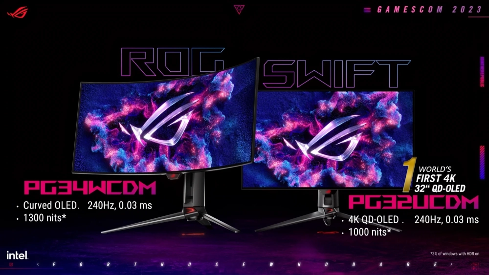 Asus ROG Swift (PG34WCDM) получил панель с кривизной 800R, разрешением 3440 x 1440 пикселей и частотой обновления 240 Гц. OLED-матрица обеспечивает насыщенные цвета, глубокий чёрный и время отклика 0,03 мс (GtG). Есть совместимость с технологией Nvidia G-Sync. Пиковая яркость — 1300 нит.