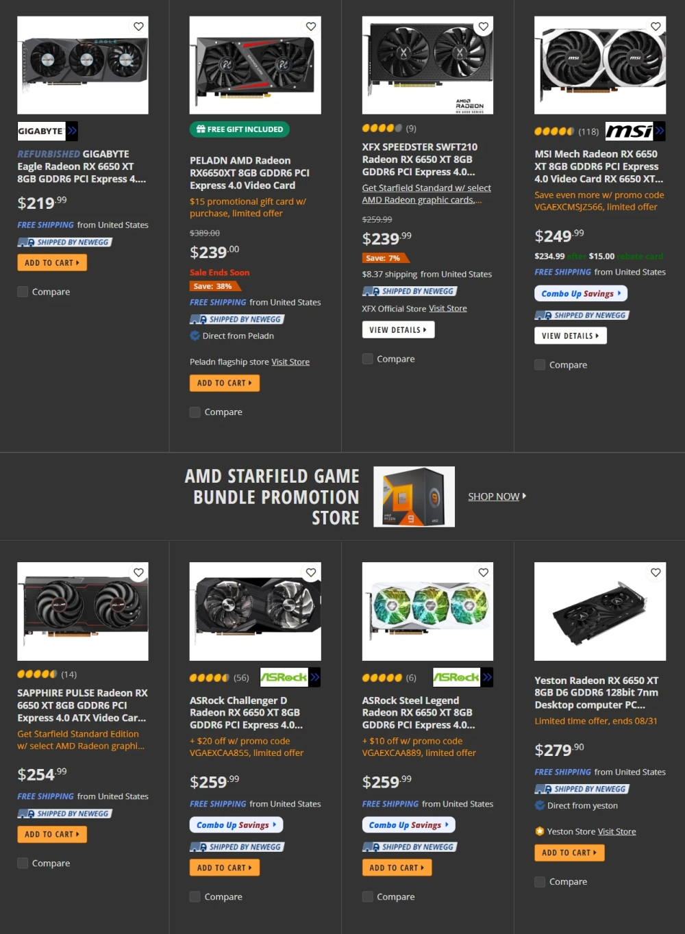 На данный момент RX 6650 XT можно купить в зарубежных магазинах по цене около 220 долларов (~21 000 рублей). При этом в подарок дают копию Starfield — это одна из самых ожидаемых игр 2023 года. Radeon RX 6650 XT также поддерживает новую технологию масштабирования AMD FSR 3.