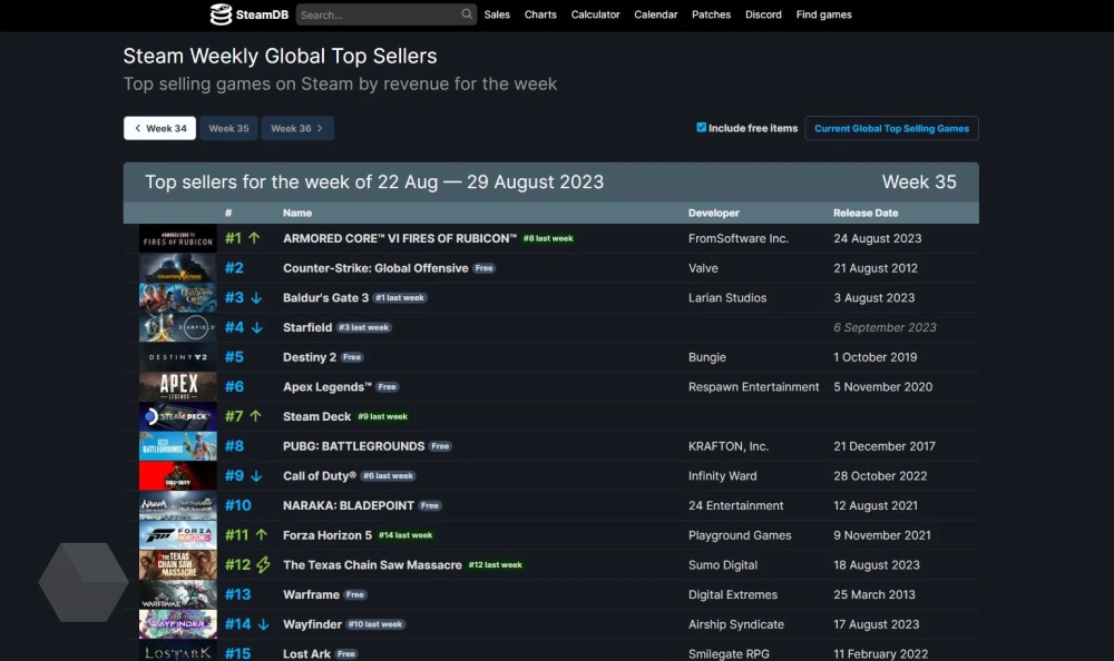Чарт Steam с 22 по 29 августа: Armored Core VI скинула Baldur’s Gate 3 с первого места
