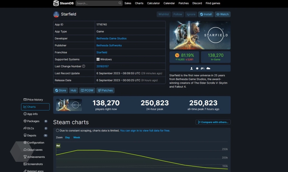 По данным сервиса SteamDB, пиковый онлайн Starfield поднялся до 250 000 геймеров. После релиза в раннем доступе показатель был больше 230 000 игроков.