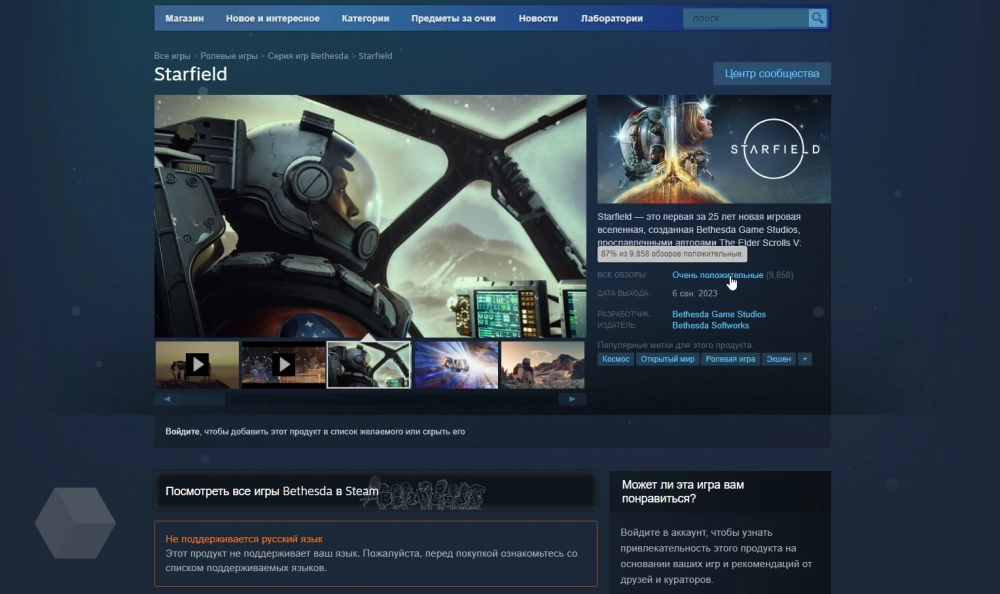Ночью 6 сентября состоялся полноценный релиз ролевой игры Starfield. В первые часы после выхода в Steam набралось почти 10 000 отзывов, а рейтинг одобрения составляет 87%. Большинство пользователей магазина Valve игру хвалит, но есть и недовольные.