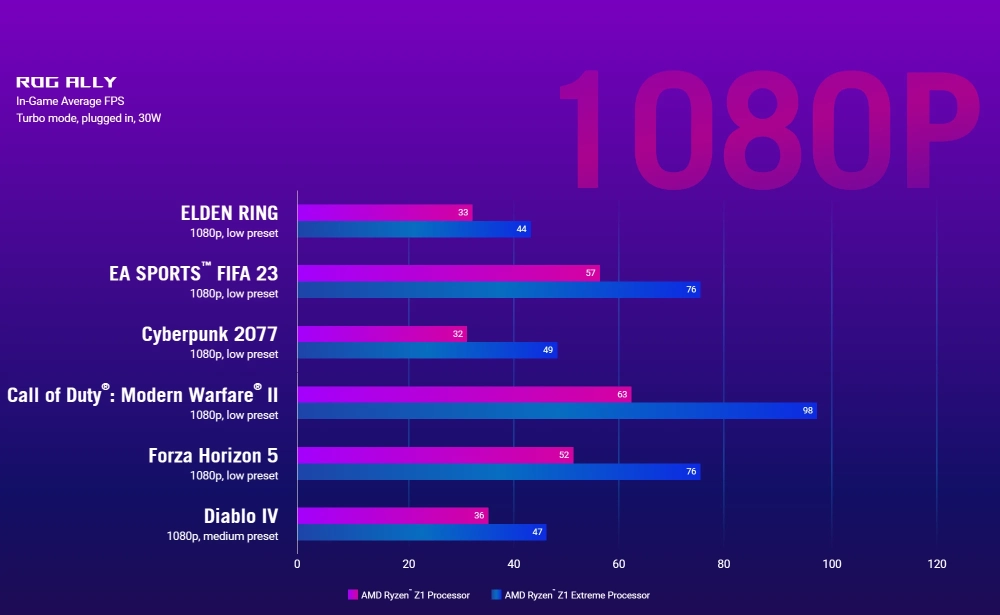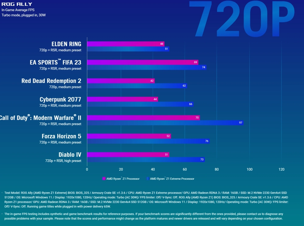 Насколько младший процессор медленнее? Судя по опубликованным результатам, существенно. В тестах в режиме 30 Вт при разрешении 1080p Z1 Extreme лидирует во всех играх, обеспечивая разницу в производительности 30–40%.