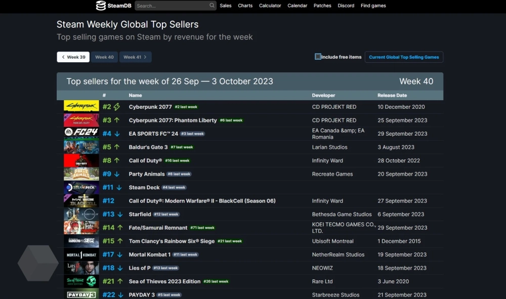 Обновлённая «Контра» возглавила топ, где учитываются как платные товары, так и F2P. «Киберпанк» же и новое DLC для него стали лидерами в списке платных тайтлов. Также в топ-10 платных игр попал новый симулятор футбола EA Sports FC 24. Да, FIFA на рынке больше нет. Baldur's Gate 3 тоже упорно держится в первой пятёрке. Да и неоднозначную Starfield всё ещё можно увидеть в первой десятке.