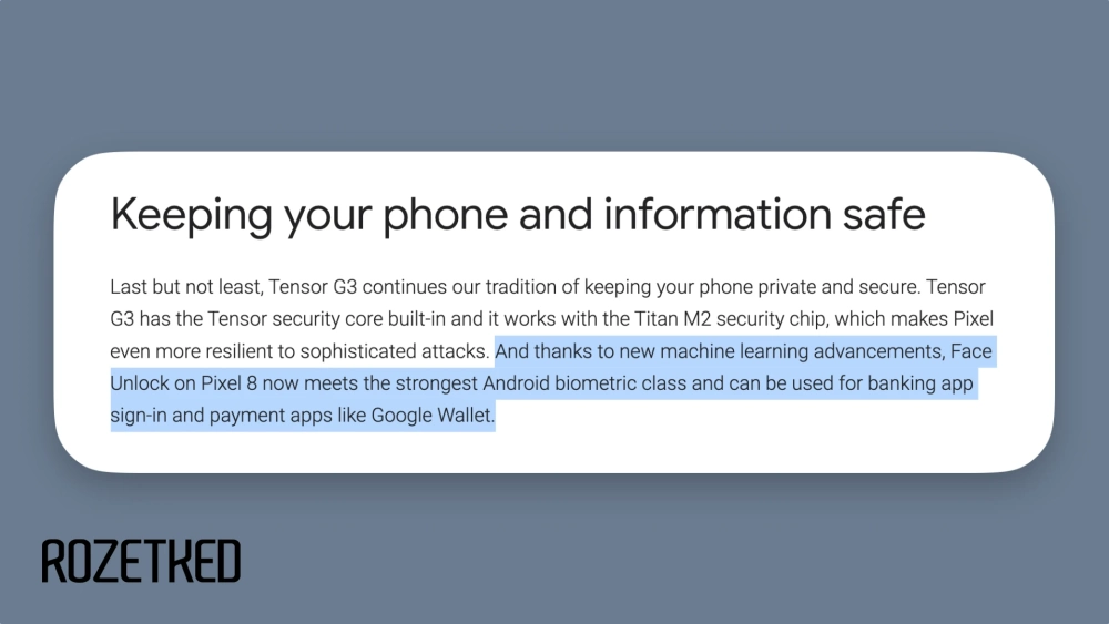 В пресс-релизе сказано, что Face Unlock соответствует «наивысшему» классу. Однако в Pixel 8 функция, как и в Pixel 7, полагается на единственную фронтальную камеру. Google объясняет, что повышения надёжности удалось добиться благодаря «достижениям в машинном обучении».