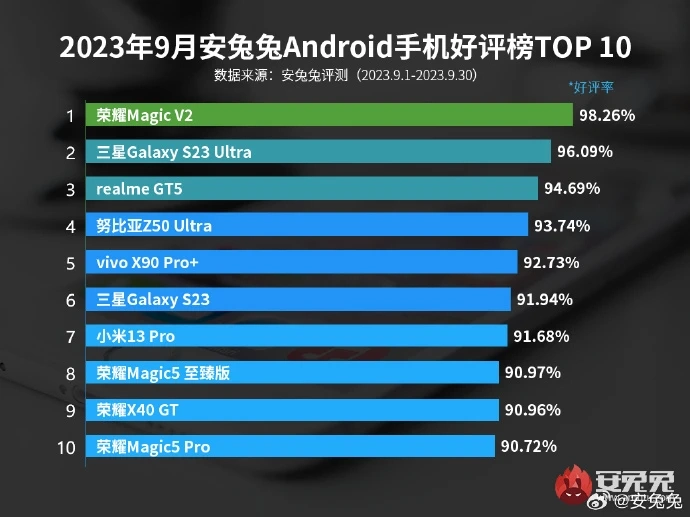 В десятке, помимо прочих, можно увидеть базовый Samsung Galaxy S23, а также Nubia Z50 Ultra, Xiaomi 13 Pro и Honor X40 GT. На последнем месте расположился Honor Magic 5 Pro. Телефоном довольны 90,72% пользователей.