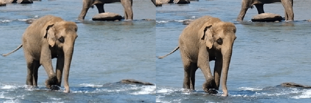Итоговые кадры получаются намного чётче, чем исходные. Кроме того, технология ещё добавляет детали к объектам. В примере со слонёнком видно, как Adobe Res-Up «прокачал» кожу животного, на ней появились складки.