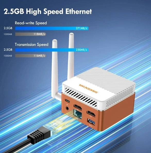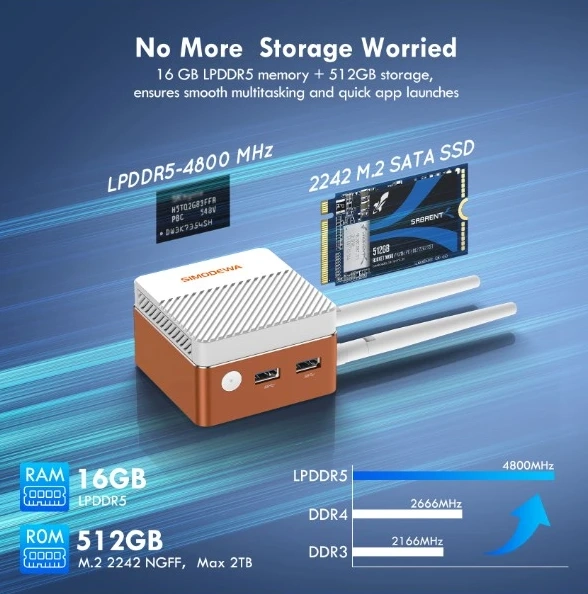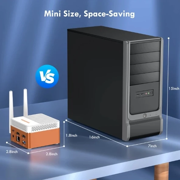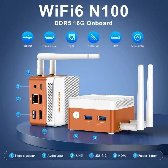 Модель выполнена в виде компактного двухцветного кубика, который поместится в кармане. Размеры корпуса: 7×7×4,5 см. Начинка для таких размеров вполне сносная — внутри стоит 4-ядерный чип Intel Alder Lake N100 в сочетании с GPU Intel UHD, 16 ГБ ОЗУ LPDDR5 и накопителем SATA SSD ёмкостью до 1 ТБ.