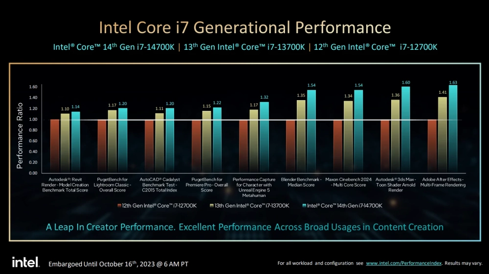 Флагманский процессор Core i9-14900K сможет достичь тактовой частоты 6 ГГц. Ранее это смог сделать Core i9-13900KS, но он не был доступен широкому кругу пользователей. Судя по тестам, чип на 23% быстрее AMD Ryzen 9 7950X3D в Starfield (FHD) и на 54% быстрее в Premiere Pro и After Effects. Стоимость — 589 долларов (~57 780 рублей).