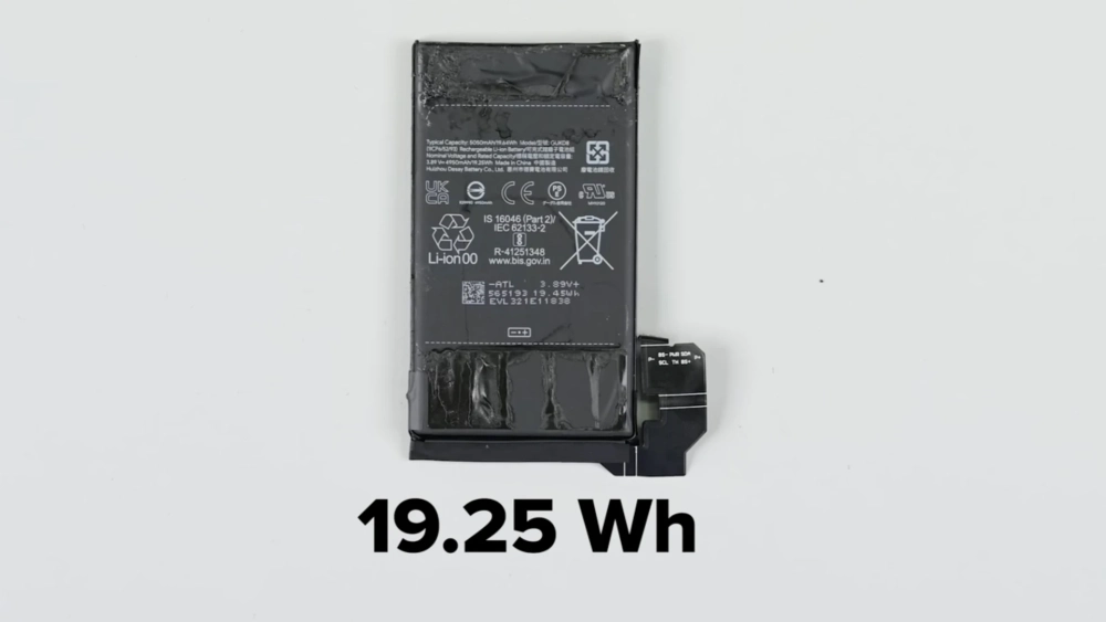 Чтобы добраться до аккумулятора, понадобится сначала расправиться с 5G-антенной, отклеить плёнку для отвода тепла и открутить несколько винтов. На аккумуляторной панели есть пластиковые язычки, но потянув за них, извлечь батарею у специалиста не вышло. Ёмкость аккумулятора — 19,25 Вт/ч или 5050 мАч.