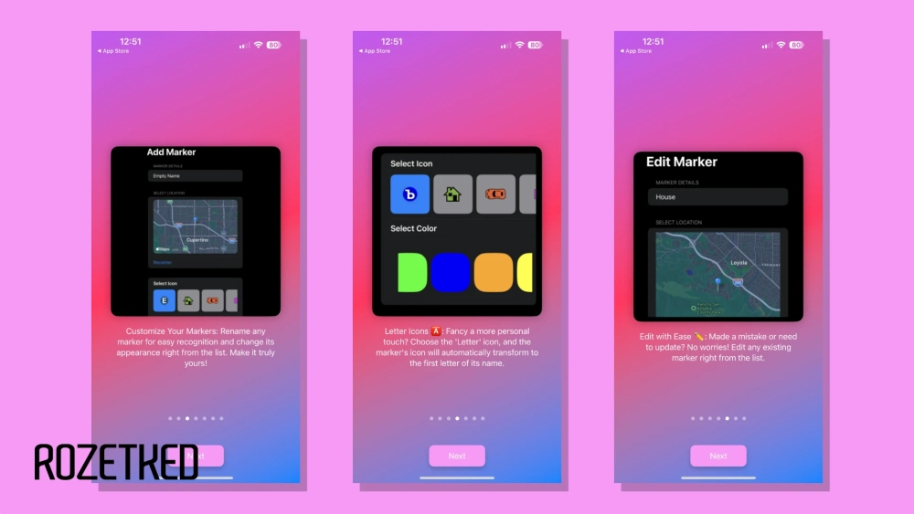Работает так: на iPhone пользователь добавляет метки для локаций — например, дом или любимые места — на карту. Точкам можно задать название, значок в духе Vice City и цвет.