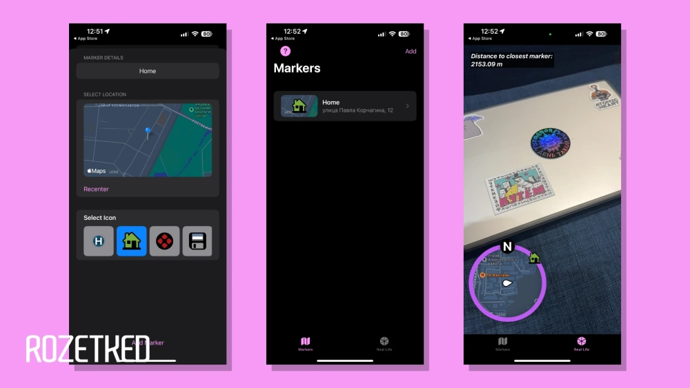 После настройки доступен AR-режим, в котором поверх изображения с камеры наложена та самая мини-карта. Приложение можно синхронизировать с Apple Watch: на часах отображается только карта, зато со смартфона «подтягиваются» все сохранённые метки.