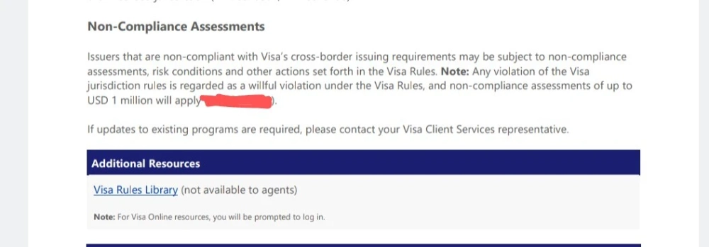 По её словам, карты Visa запрещено открывать россиянам-нерезидентам, а представители одного из банка рассказали, что гражданам России вообще запрещено иметь счета Visa в зарубежных банках. В качестве доказательства она приводит скриншот, на котором указана сумма штрафа — до миллиона долларов.