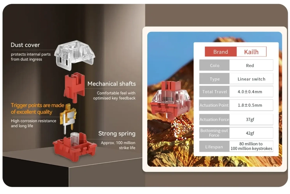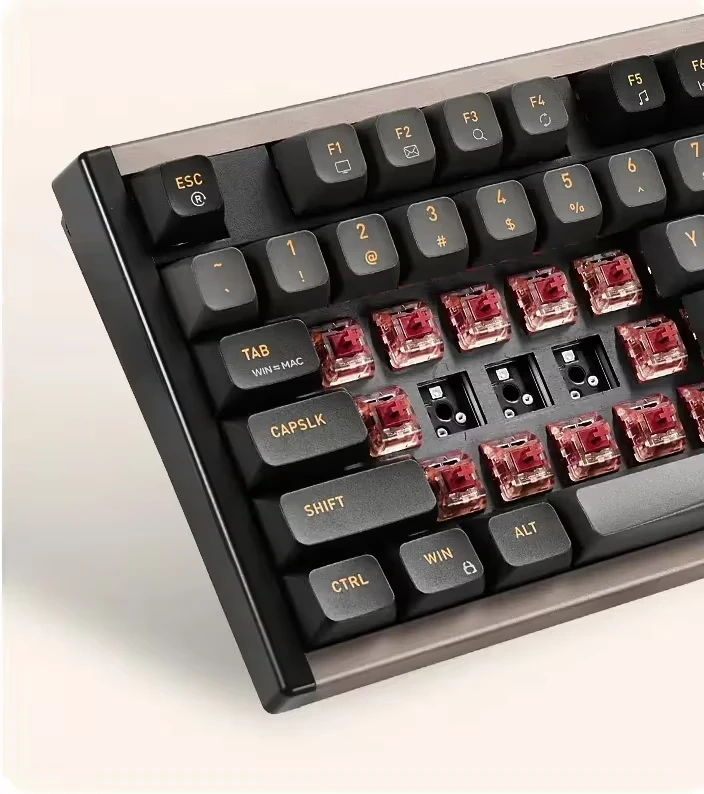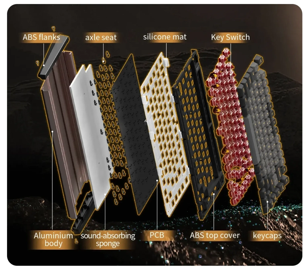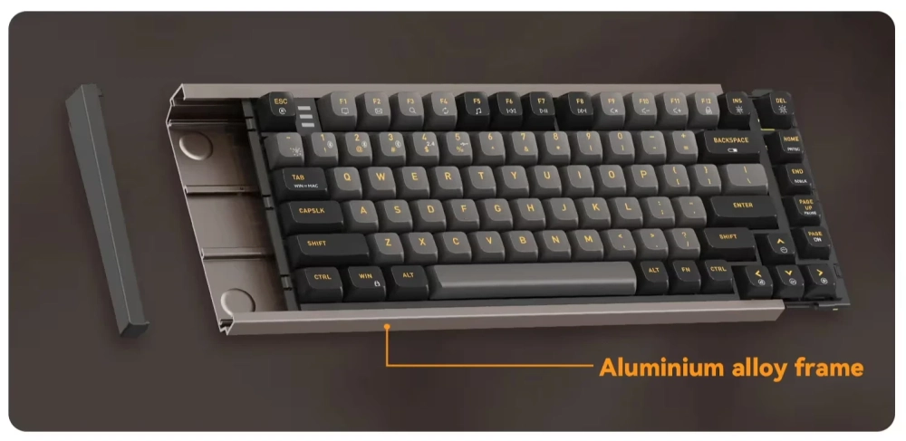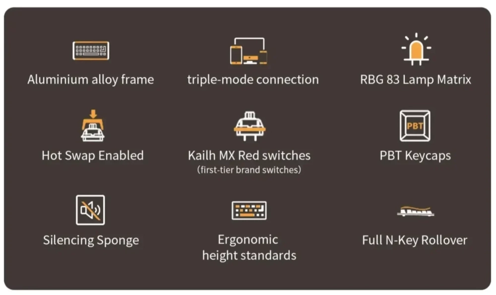 Новинка доступна в нескольких расцветках, включая чёрно-оранжевую. Дизайн нельзя назвать вычурным. Корпус выполнен из анодированного алюминия. Цифрового блока справа нет. Кейкапы сделаны из ПБТ. Клавиатура получила подсветку RGB. Под колпачками можно увидеть линейные переключатели Kailh MX Red, обеспечивающие плавное нажатие. Поддерживается хот-свап — переключатели можно быстро заменять.