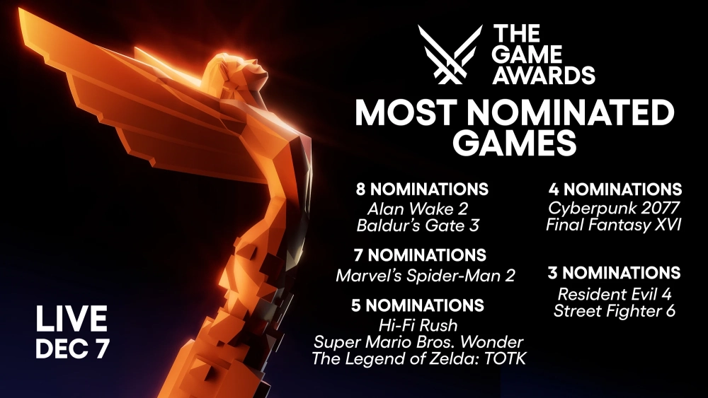 В номинации «Игра года» поборются Alan Wake 2, Baldur's Gate 3, Marvel’s Spider-Man 2, Resident Evil 4, Super Mario Bros. Wonder и The Legend of Zelda: Tears of the Kingdom.