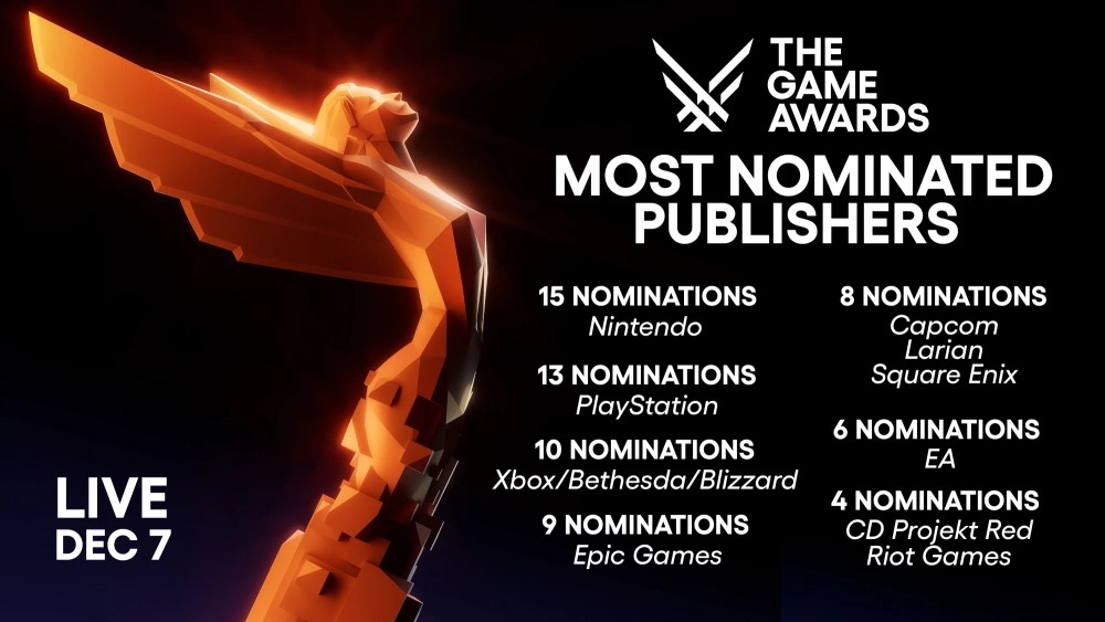 Среди издателей лидером по количеству номинаций стали Nintendo (15), PlayStation (13) и Xbox (10).